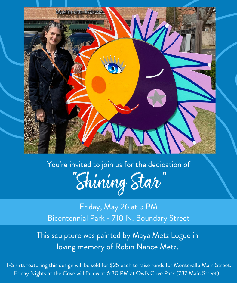 Montevallo Main Street’s Design Committee is hosting a small dedication ceremony for the sculpture (pictured at right), entitled “Shining Star,” at 5 PM on Friday, May 26th at Bicentennial Park (710 N. Boundary Street, in front of Main Street Tavern). Friday Nights at the Cove will follow that evening at 6:30 PM at Owl’s Cove Park. We will also be selling our new t-shirts as a fundraiser, featuring this sun design, at both events. Please make plans to join us!