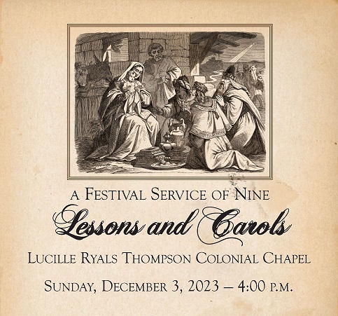 Please join us Sunday, December 3 from 4:00 p.m. until 5:00 p.m. in the Colonial Chapel for A Festival Service of Nine Lessons and Carols - an annual Christmas tradition of song and scripture.