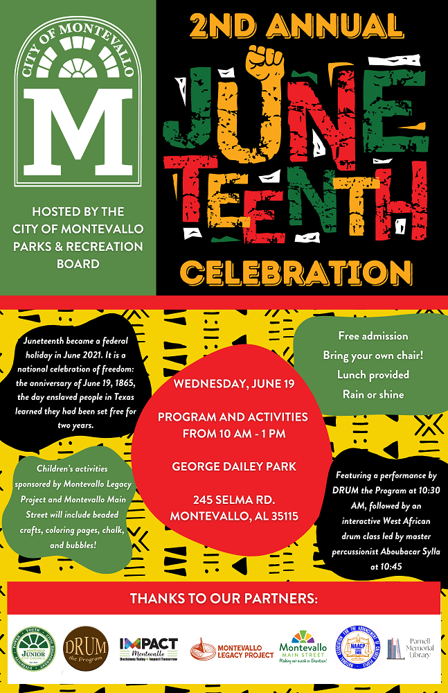 “We are excited to host our 2nd Annual Juneteenth celebration in George Dailey Park,” said Pamela Smith, Chair of Montevallo’s volunteer Parks & Recreation Board. “We invite everyone to join us on June 19th to honor the resilience, courage, and enduring spirit of those who fought tirelessly for liberation. This event, a vision and dream of the late Parks & Recreation Board Member Johnny Holsombeck, is a testament to the ongoing pursuit of justice and equality for generations to come.”