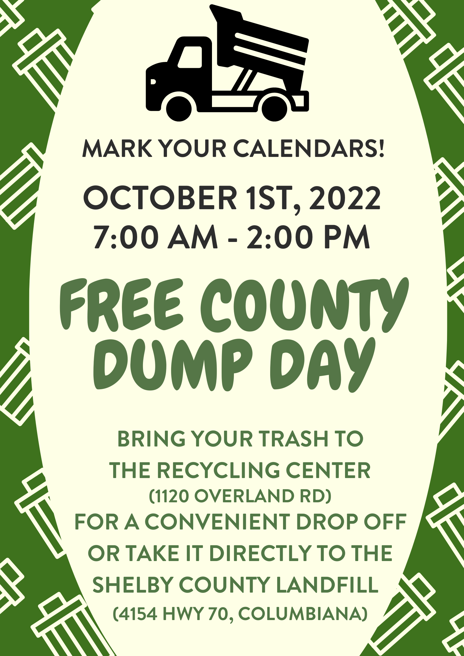 NOTICE/ SAVE the DATE: Saturday, October 1st the Recycling Center HOURS will be 7:00 am - 2:00 pm participating in the FREE Shelby County Landfill Day.