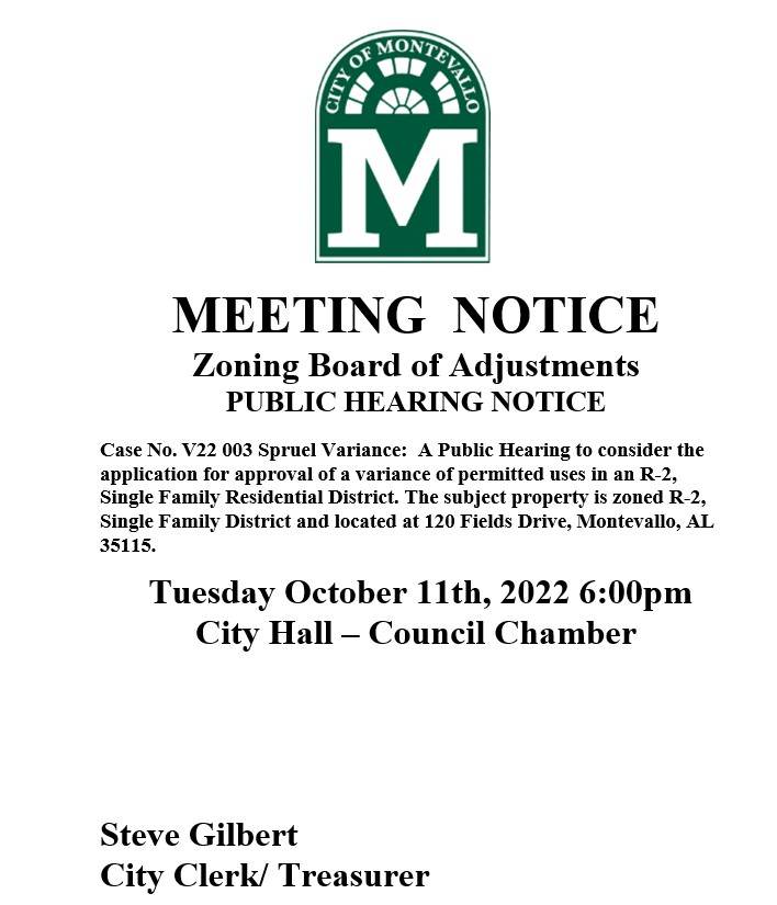 Case No. V22 003 Spruel Variance: A Public Hearing to consider the application for approval of a variance of permitted uses in an R-2, Single Family Residential District. The subject property is zoned R-2, Single Family District and located at 120 Fields Drive, Montevallo, AL 35115.