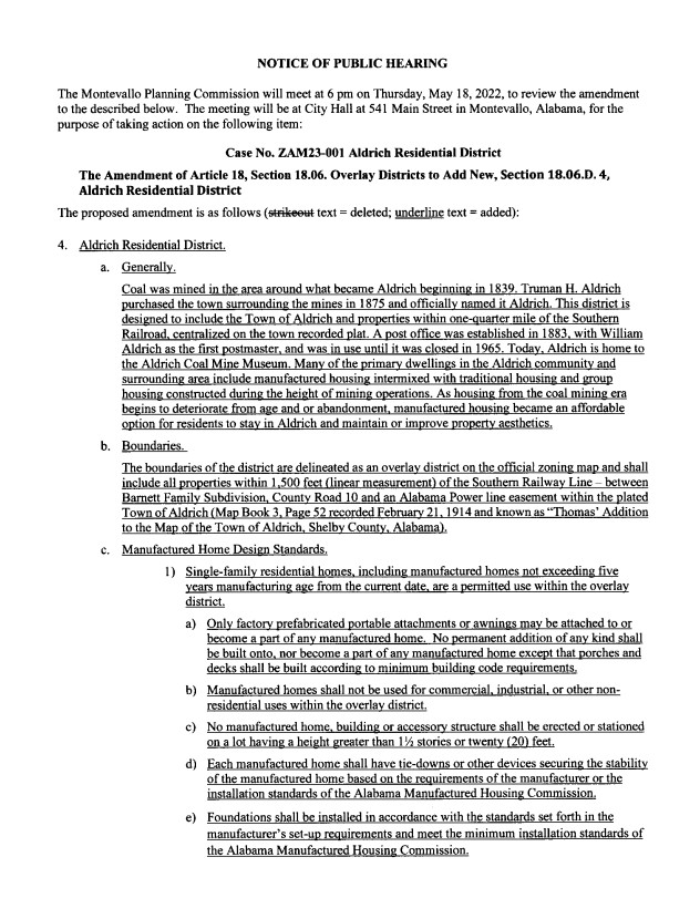 NOTICE OF PUBLIC HEARING: Case No. ZAM23-001 Aldrich Residential District - Thursday, May 18, 2023, City Hall at 541 Main Street in Montevallo, Alabama