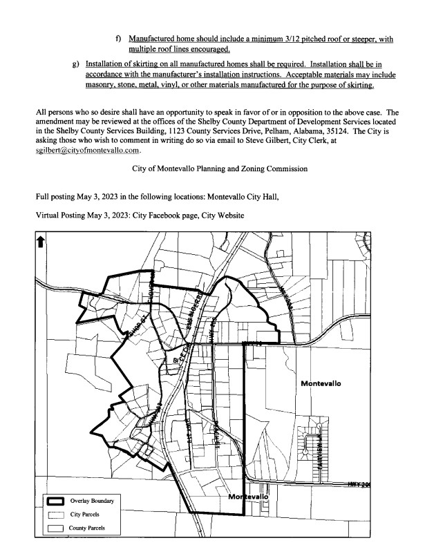 The Montevallo Planning Commission will meet at 6 pm on Thursday, May 18, 2023, to review the amendment to the described below.  The meeting will be at City Hall at 541 Main Street in Montevallo, Alabama, for the purpose of taking action on the following item: