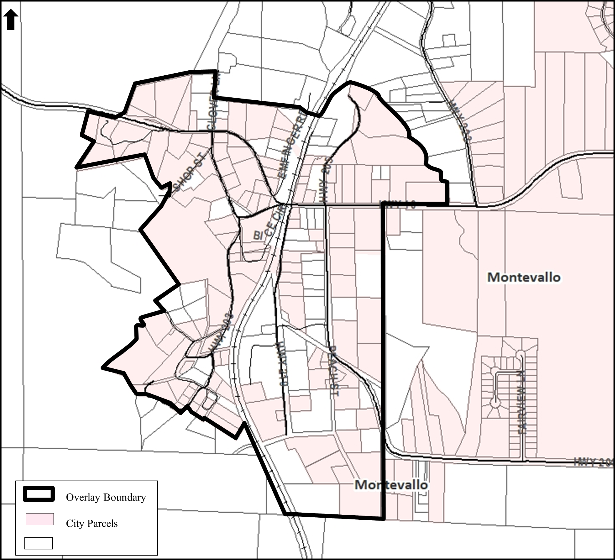 The boundaries of the district are delineated as an overlay district on the official zoning map and shall include all properties within 1,500 feet (linear measurement) of the Southern Railway Line – between Barnett Family Subdivision, County Road 10 and an Alabama Power line easement within the plated Town of Aldrich (Map Book 3, Page 52 recorded February 21, 1914 and known as “Thomas’ Addition to the Map of the Town of Aldrich, Shelby County, Alabama).