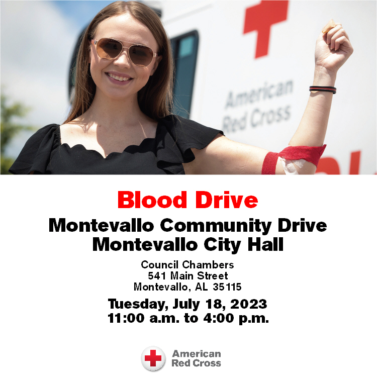 Montevallo Community Blood Drive on Tuesday, July 18, 2023, 11am - 4 pm.