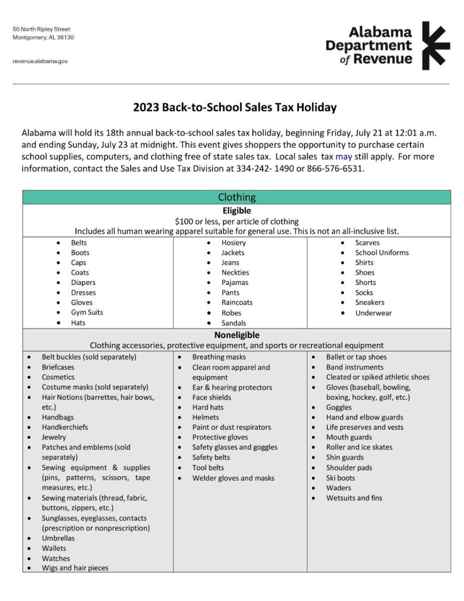 The Back-To-School Sales Tax Holiday begins at 12:01 a.m. this Friday, July 21st at 12:01am through Sunday, July 23rd at midnight, pursuant to §40-23-210 to §40-23-213, Code of Alabama 1975. Follow this Link to the Alabama Department of Revenue for Detailed Information: www.revenue.alabama.gov/sales-use/sales-tax-holiday and to download the forms.