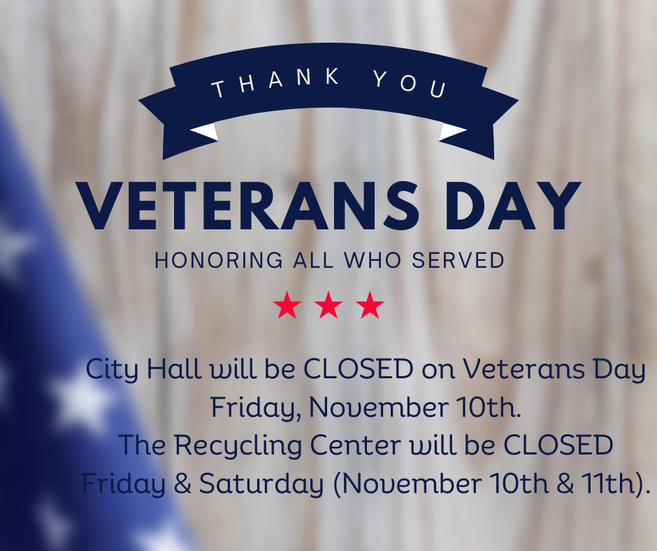 NOTICE: City Hall will be CLOSED on Friday, November 10th for Veterans Day - The Recycling Center will be CLOSED on Friday and Saturday (November 10th & 11th) in observance of Veterans Day.
