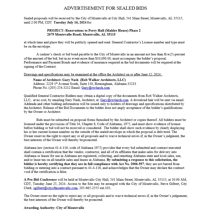 A Pre-Bid Conference will be held at Montevallo City Hall, 541 Main Street, Montevallo, AL 35115, at 10:00 AM, CDT, Tuesday June 25, 2024. Access to the Site may be arranged with the City of Montevallo, Steve Gilbert, City Clerk, sgilbert@cityofmontevallo.com, 205-665-2555 ext.105.