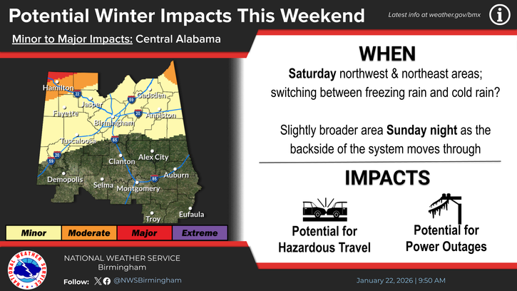 There is a risk of a wintry mix, including freezing rain, primarily affecting the northern third of Central Alabama from Friday night to Sunday night. Some locations will experience wintry precipitation longer than others, and many will fluctuate between precipitation types throughout the event. A shot of frigid air will move in behind this weather system. Check weather.gov/bmx for forecast updates. Preparations for impacts may become necessary.